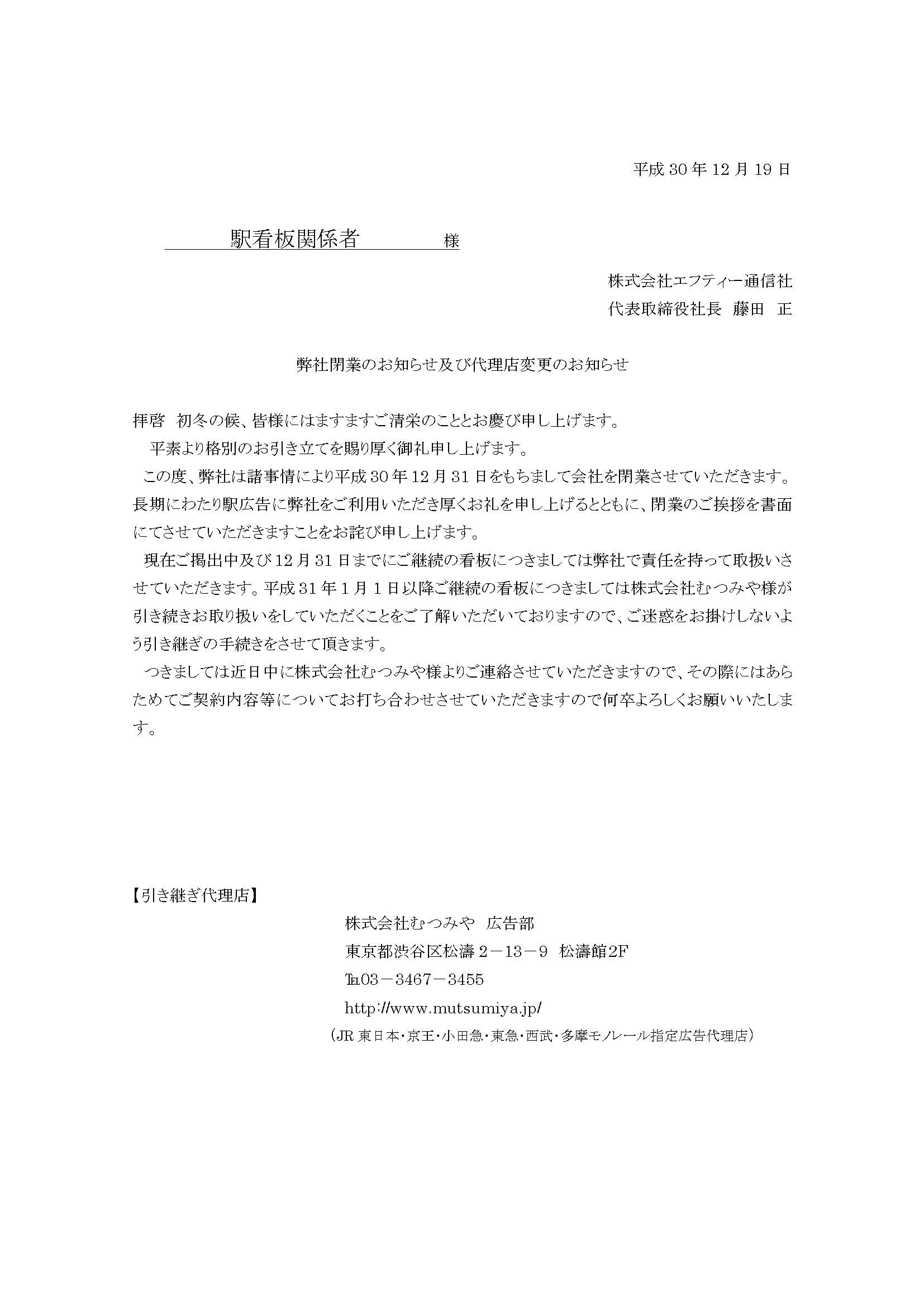 弊社閉業のお知らせ及び代理店変更のお願い <お詫び>